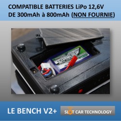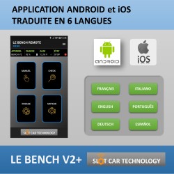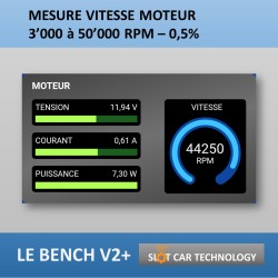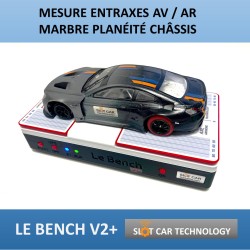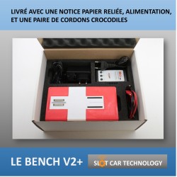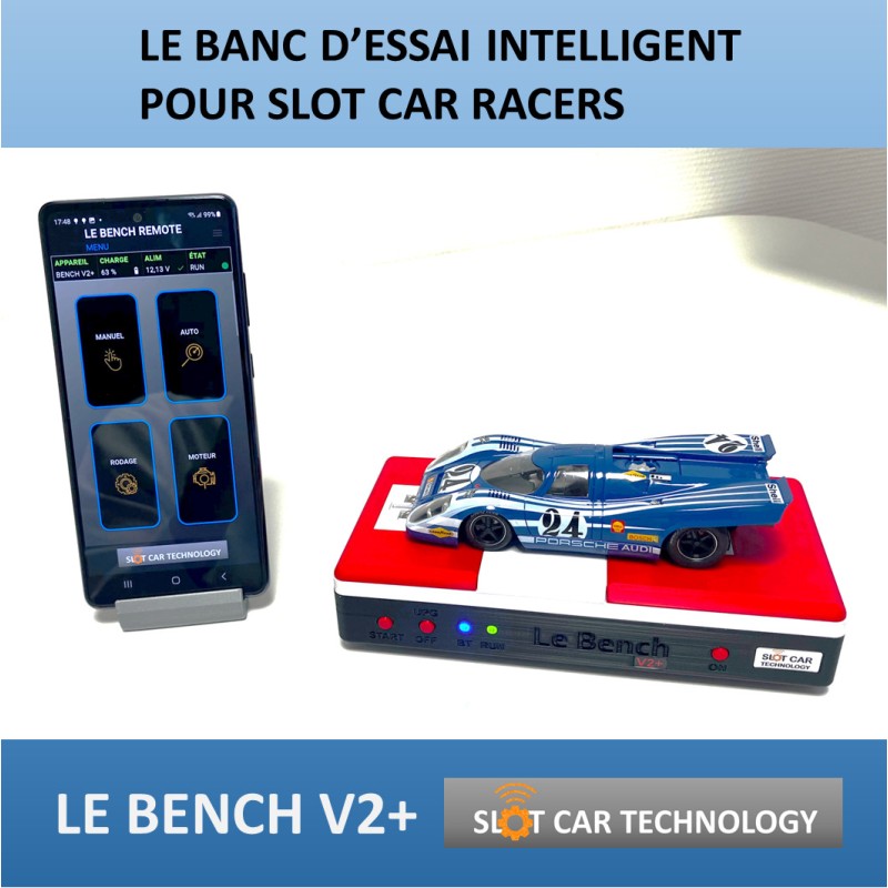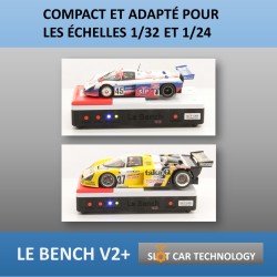 O BENCH V2+ é um banco de ensaio, diagnóstico e rodagem para carros de corrida SLOT CAR nas escalas 1/32 e 1/24.